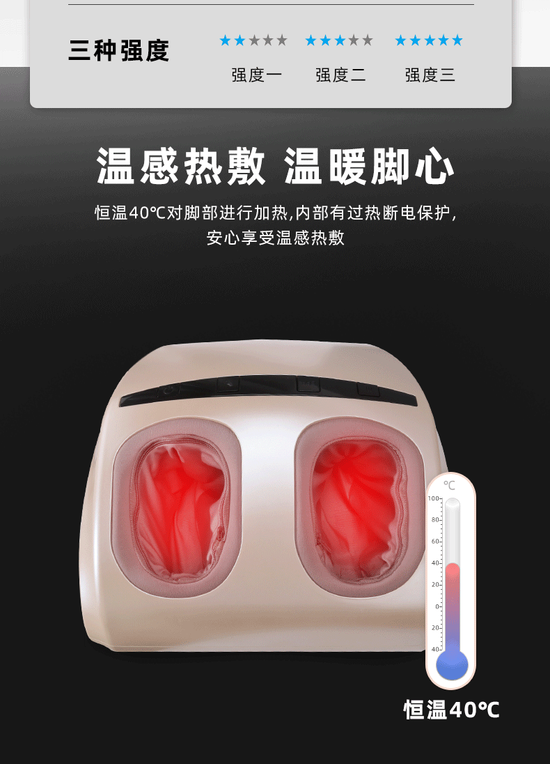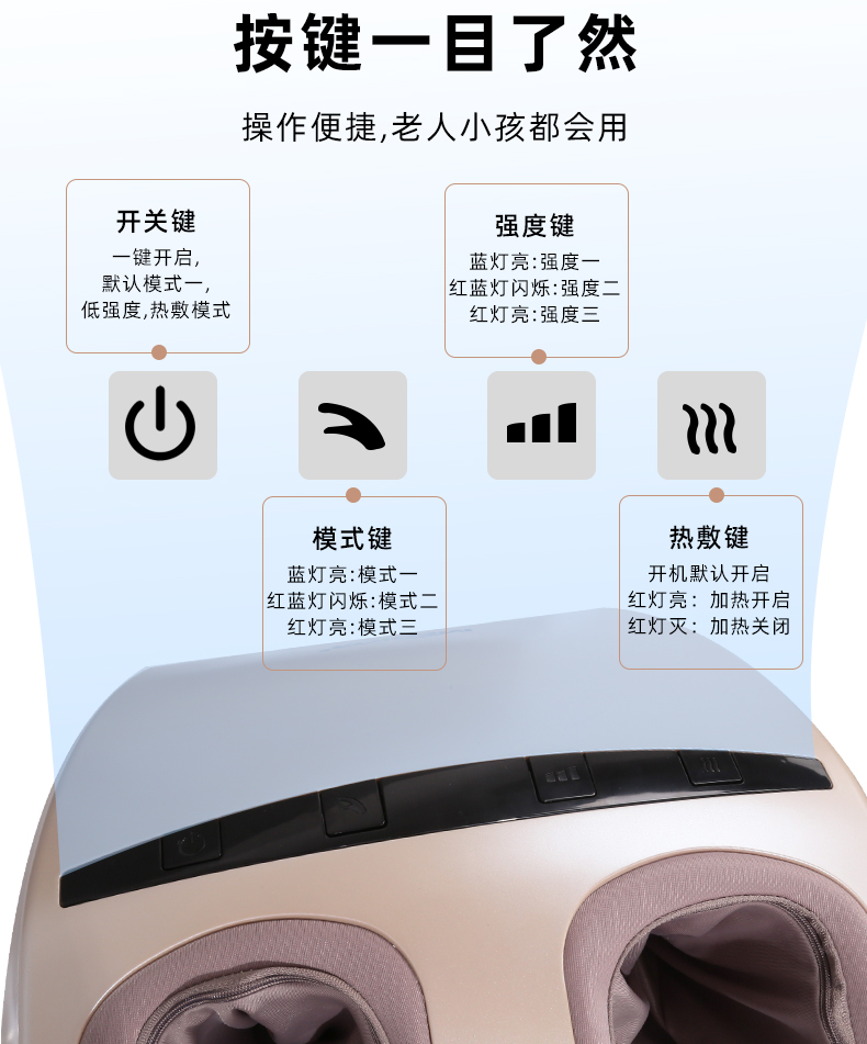 功能特征:腳底滾壓、刮痧、氣囊擠壓三段式按摩,2擋力度調(diào)節(jié),3種模式選擇,